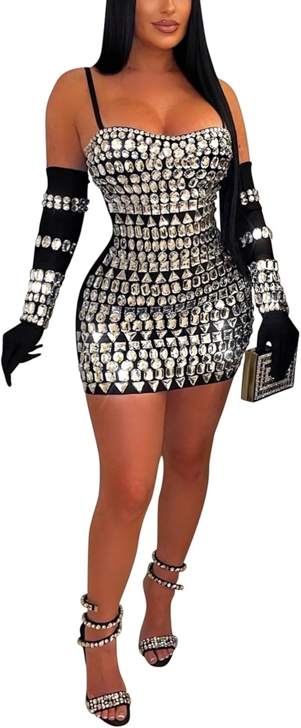 PORRCEY Women's Sexy Elegant Rhinestone Mesh See Through Dance Party Club Night Out Bodycon Mini Dress