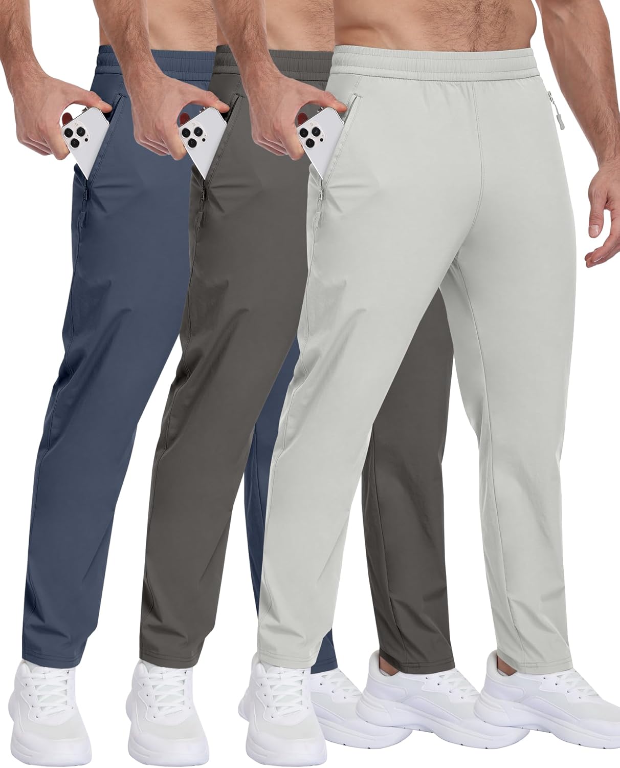 3 Pack Mens Athletic Hiking Pants with Zipper Pockets,Water Resistant Quick-Dry Lightweight Outdoor Sweatpants