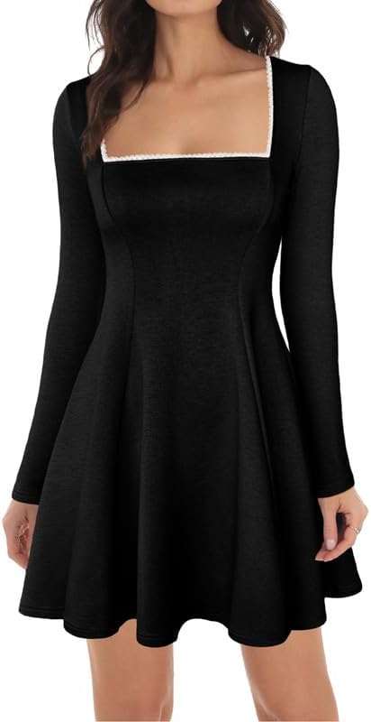 ADEWEL Women's Square Neck Ruffle Hem Mini Dress Long Sleeve A Line Pleated Dress for Women Corset Short Party Dresses