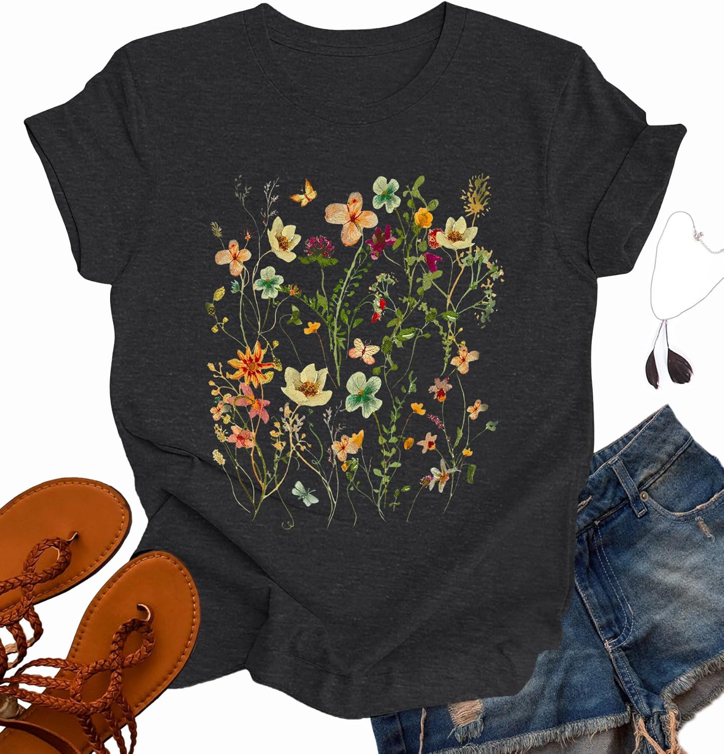 Womens Boho Shirts Vintage Floral Tshirt Cottagecore Wildflowers Graphic Tees Bohemian Short Sleeve Tops