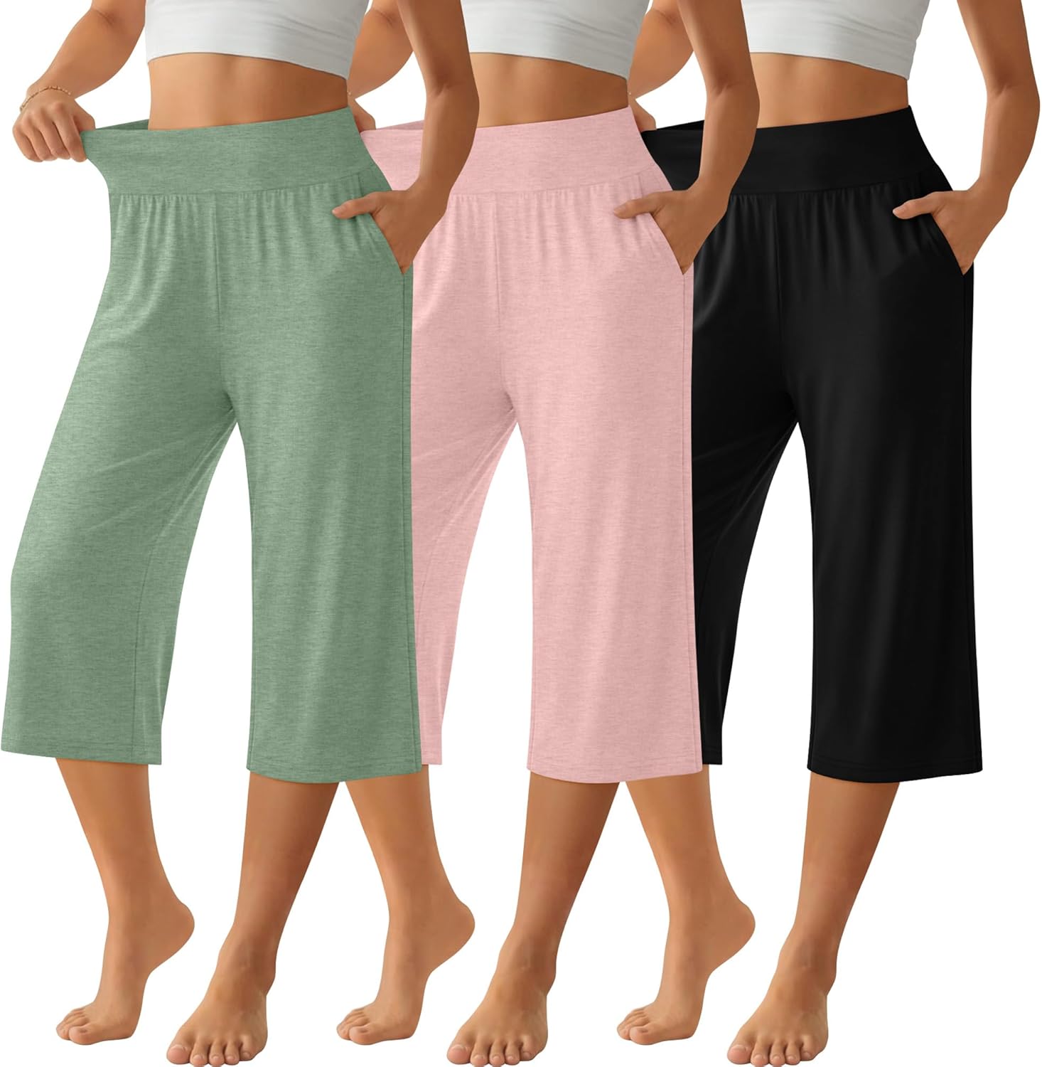 Neer 3 Pack Women Capri Pants, Wide Leg High Waist Crop Lounge Sweatpants Summer Casual Workout Pants with Pocket