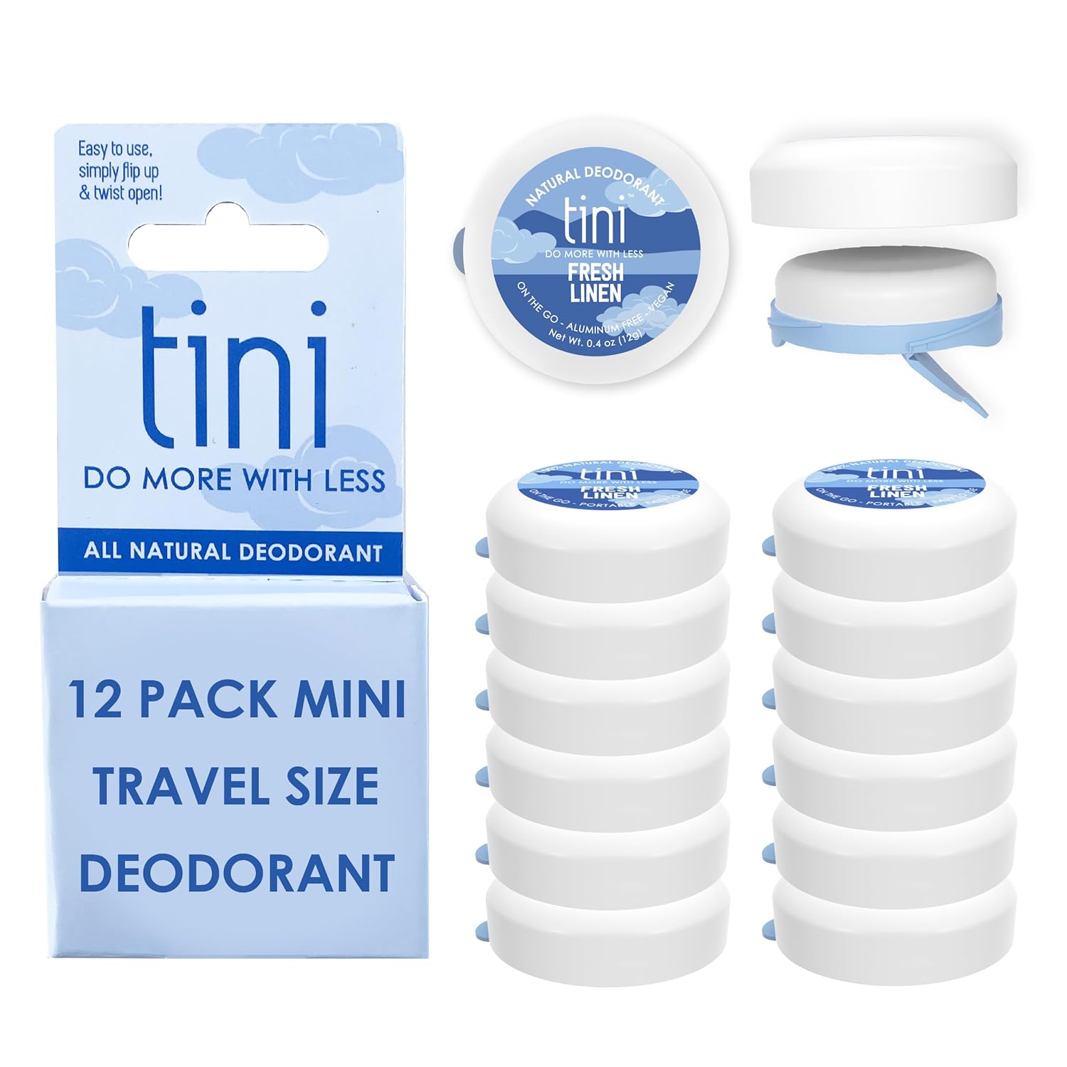 Tini Naturals Mini Travel Size Deodorant, Unisex Aluminum Free Deodorant with Coconut Oil & Shea Butter, 0.4oz each (12 Pack), Fresh Linen Scent