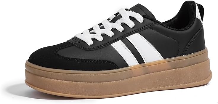 LEYING Women's Chunky Platform Sneakers - Retro Vintage Leather Casual Tennis Shoes- Thick Rubber Gum Sole Low Top Lace-Up Classic Walking Shoes