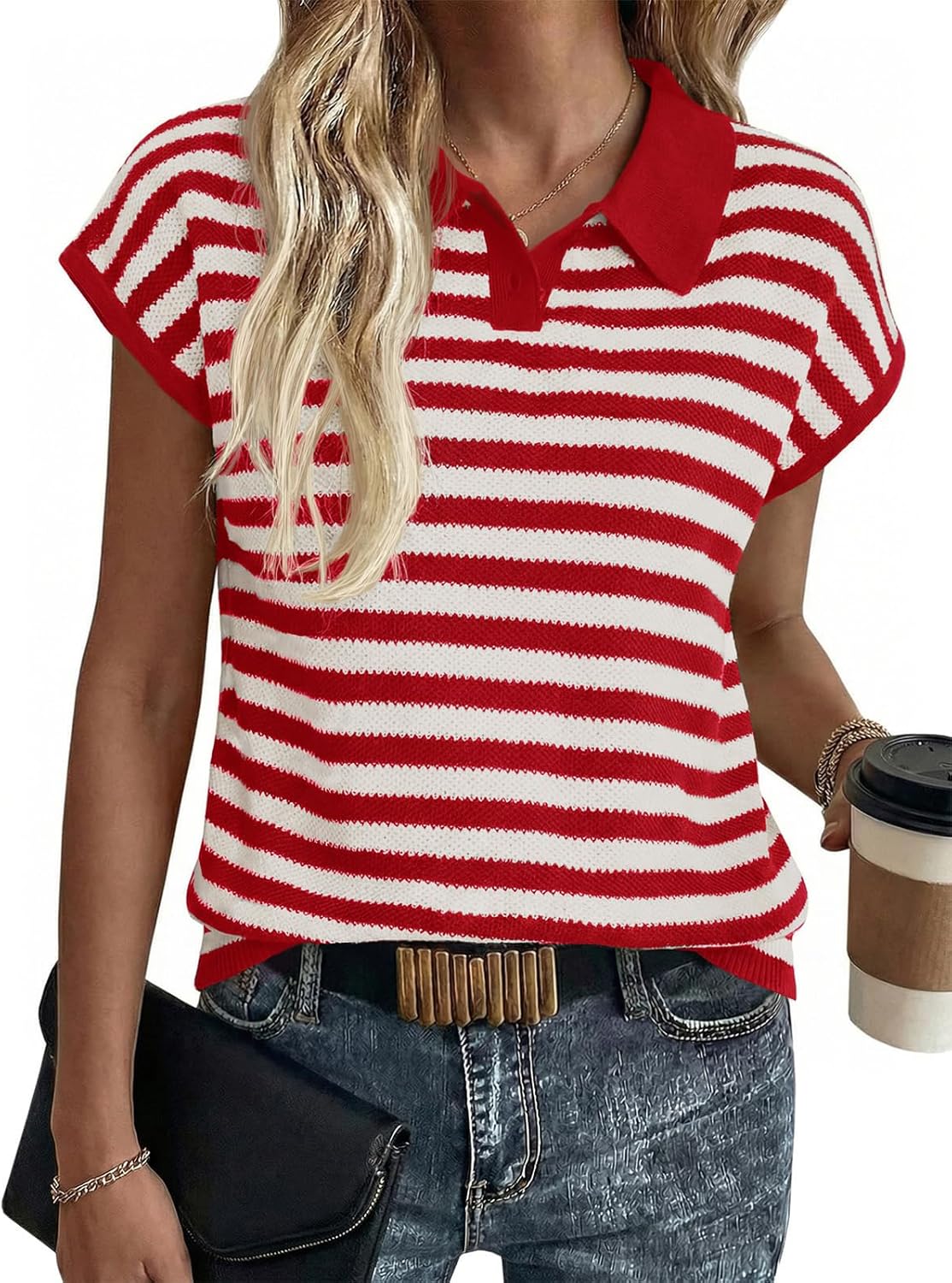Saodimallsu Womens Striped Polo Sweater Cap Sleeve Summer Top Button V Neck Collared Knit Pullover Shirts
