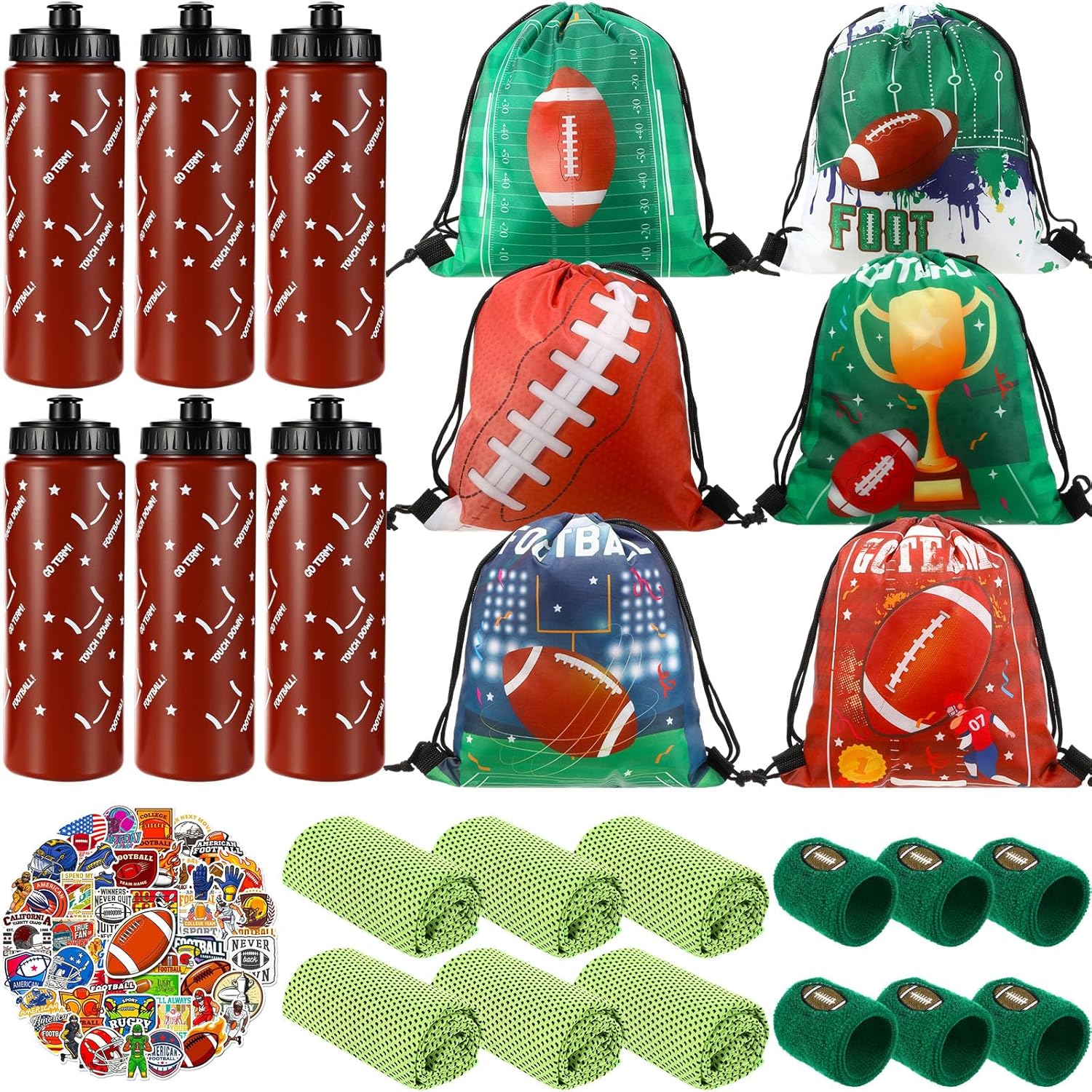 Maxdot 74 Pcs Football Party Favors with 6 Water Bottle 6 Cooling Towel 6 Sports Wristbands 6 Drawstring Gift Bag 50pcs Football Stickers, for Team Gifts Sports Party Supplies