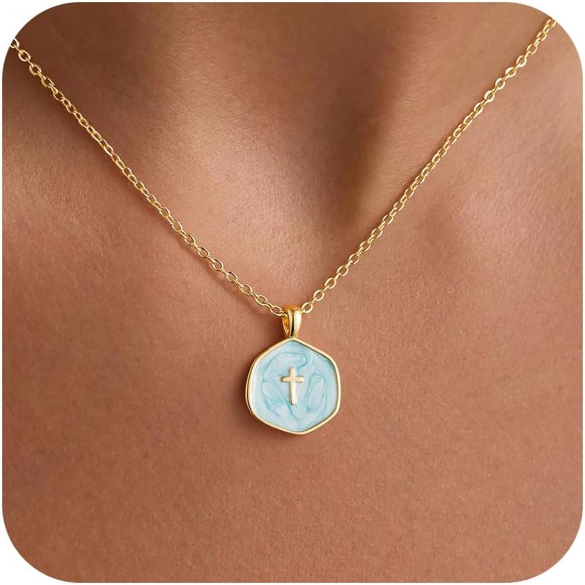 M MOOHAM Enamel Mini Cross Necklace for Women, Dainty 14K Gold Plated Cross Choker Pendant Jewelry Non Tarnish Trendy Simple Small Necklace Easter Christian Baptism Religious Faith Jewelry Gifts