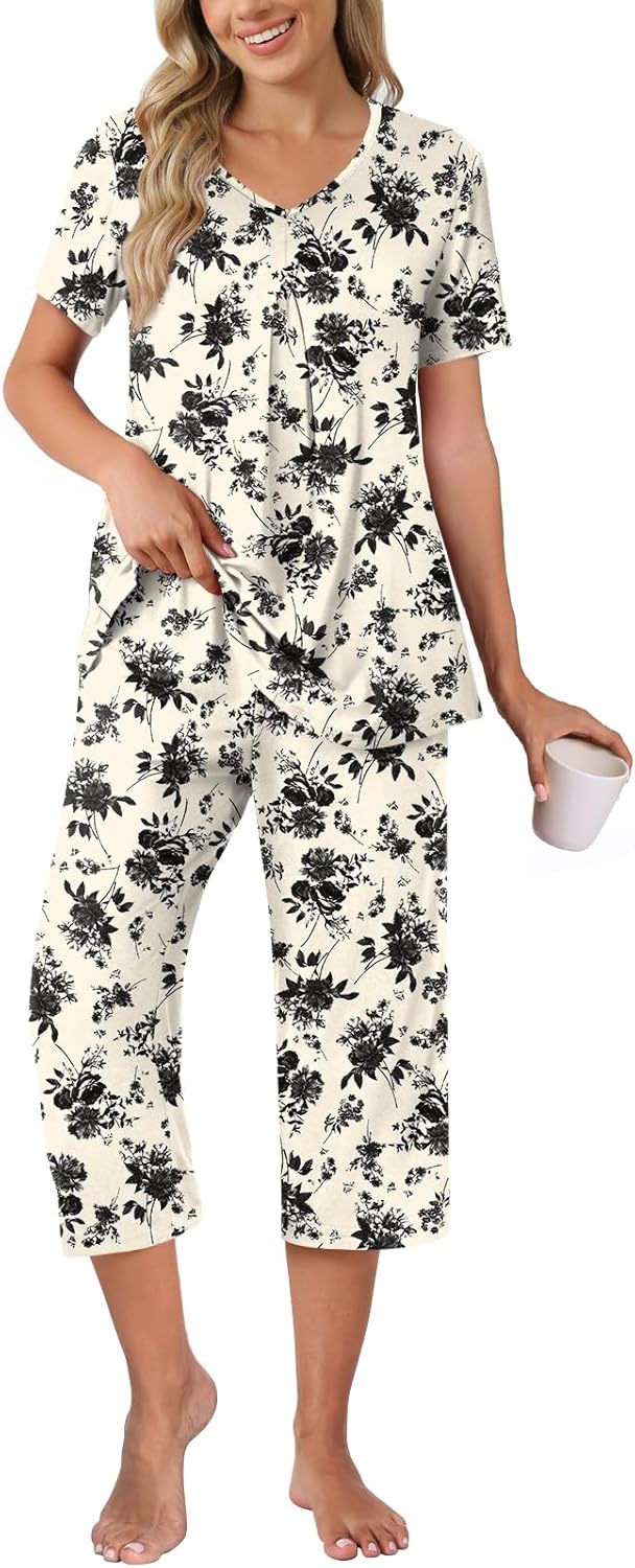 Anyally Women's Summer Capri Pajama Set Short Sleeve Shirt and Pajama Pants 2 Piece Ladies Pjs Sets