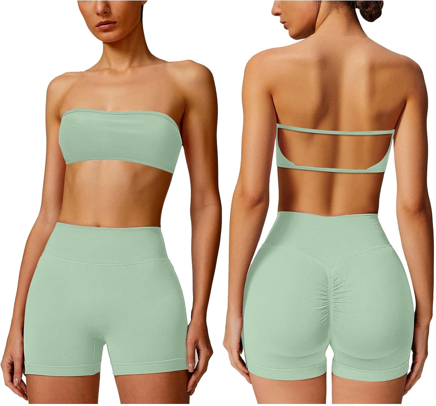 ABOCIW Workout Sets for Women Backless Bandeau Sports Bra Seamless Scunch Butt Lifting High Waist Biker Shorts Gym Set