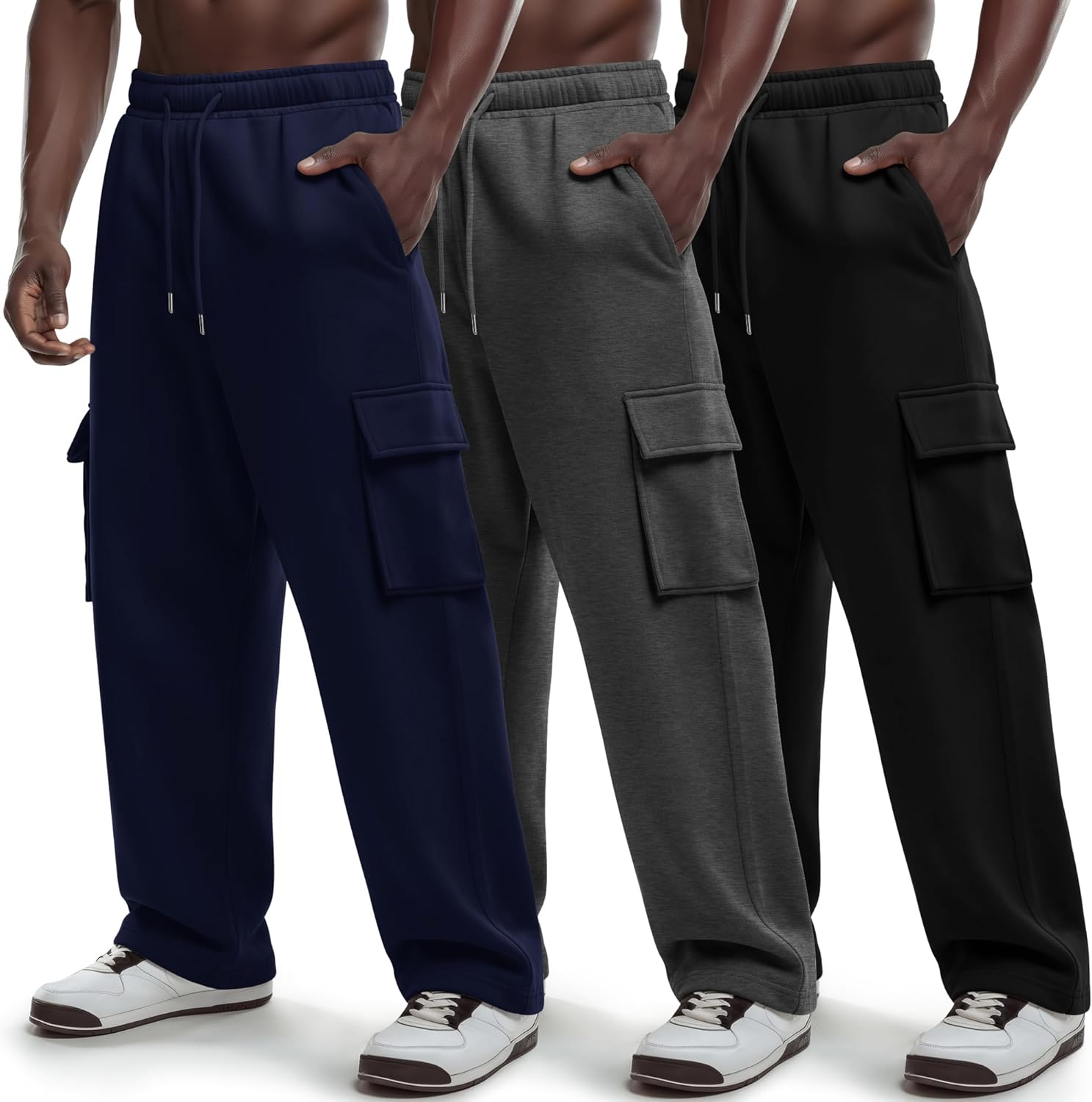 Neer 3 Pack Men's Cargo Sweatpants Athletic Straight Leg Joggers Open Bottom Track Pants Drawstring Lounge Pants with Pockets