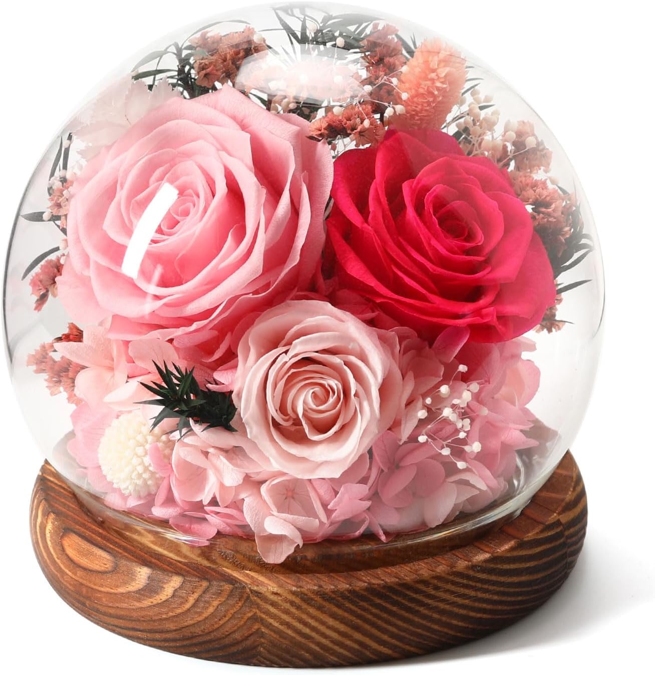 Valentines Day Flowers Gifts for Women,Forever Real Preserved Roses in Glass Dome,Valentines Roses Gifts for Her Wife Girlfriend Women Best Friend/Pink