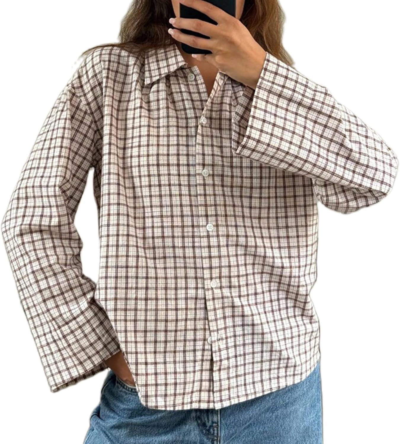 Women Vintage Button Down Shirts Retro Y2K Long Sleeve V Neck Collared Blouse Casual Fall Oversized Tunics Tops