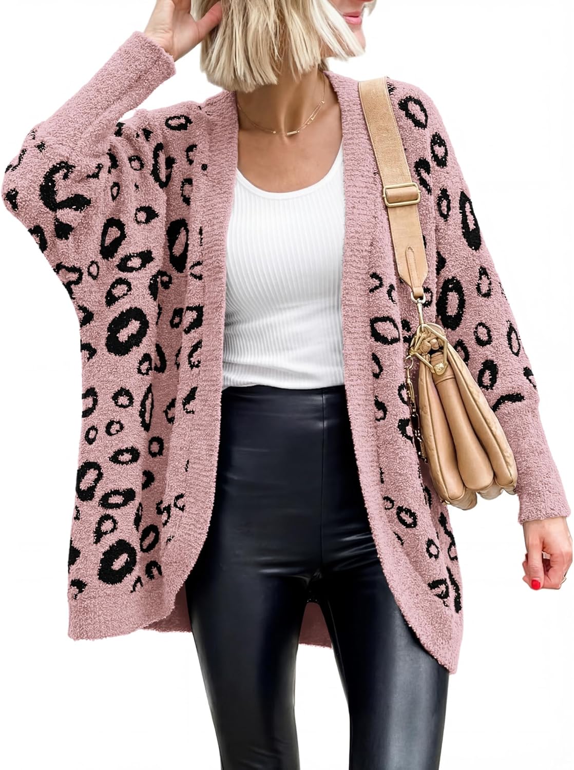 BTFBM Leopard Cardigan for Women Long Sleeve Open Front Cardigans Sweaters Pockets Loose Knit 2026 Fall Spring Outwear