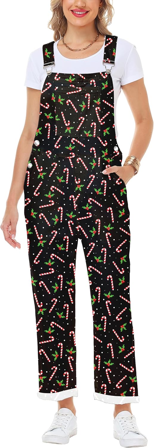 Womens Christmas Bibs Overalls Xmas Denim Coveralls Stretch Jeans Jumpsuit