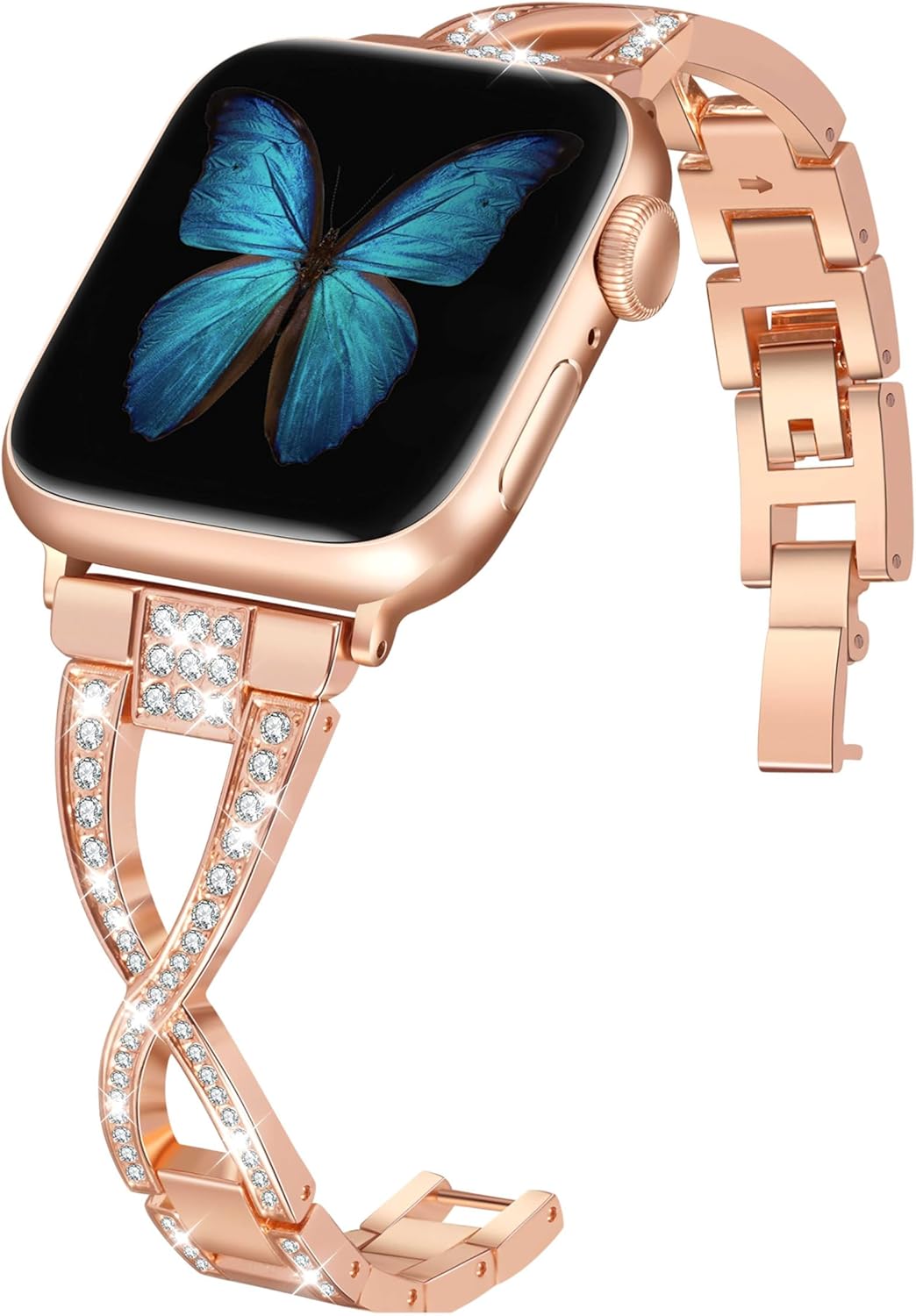 Bands for Apple Watch 38mm 40mm 41mm 42mm(Series10 11) Women Series11 10 9 8 7 6 5 4 SE iwatch Band Bling Metal Bracelet Fancy Cute Dressy Strap Rose Gold
