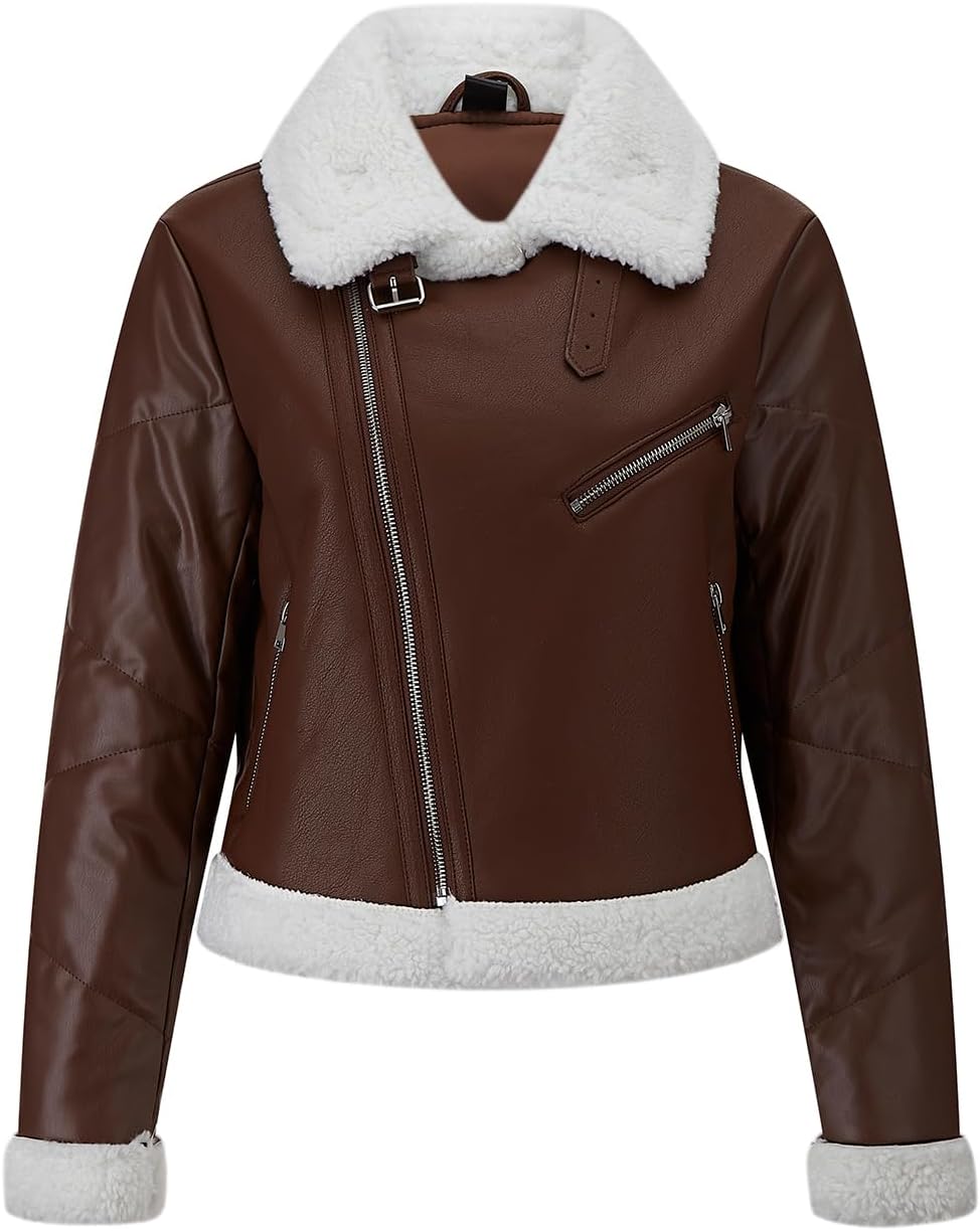 Women Fur Leather Jacket Shearing Cropped Faux Fur Lined Moto Biker Coat
