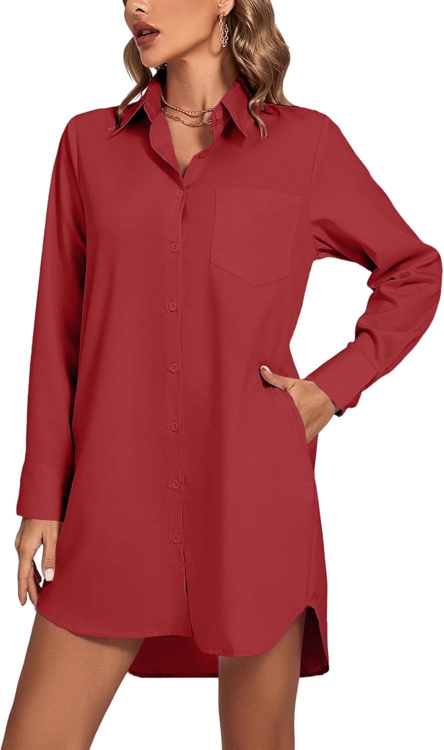 LYANER Women's Collar V Neck Button Down Long Sleeve Cruved Hem Shirt Dress