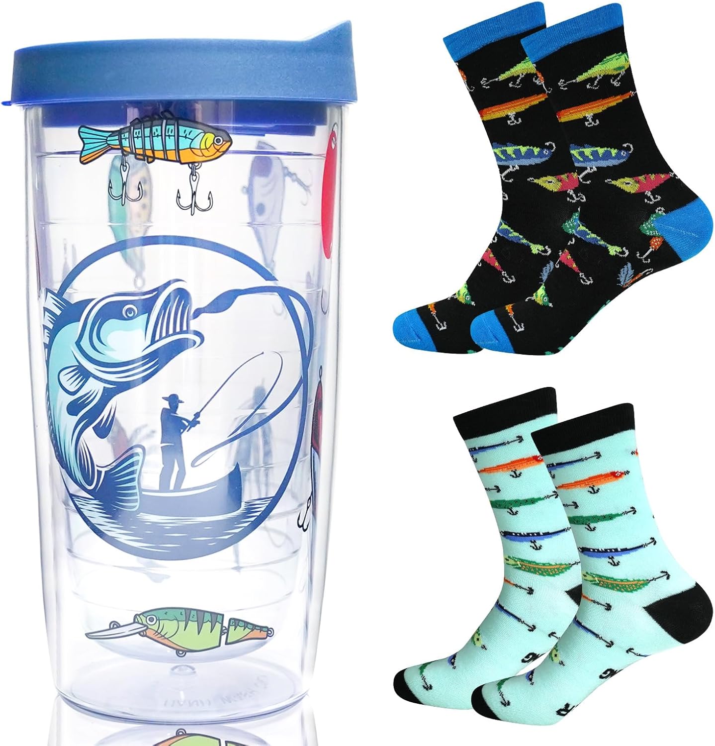 Valentine's Day Fishing Cup Gifts for Men, 14OZ Double Walled Insulated Tumbler, Travel Cup with 2 Pairs Socks, Reusable Coffee Mug Keeps Drinks Cold & Hot, Birthday Gift for Boys, Dad, Husband