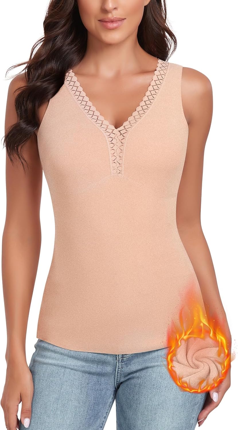 WOWENY Sleeveless Thermal Fleece Tank Top for Women V Neck Lace Camisole Warm Base Layer Cami Vest Underwear Tops