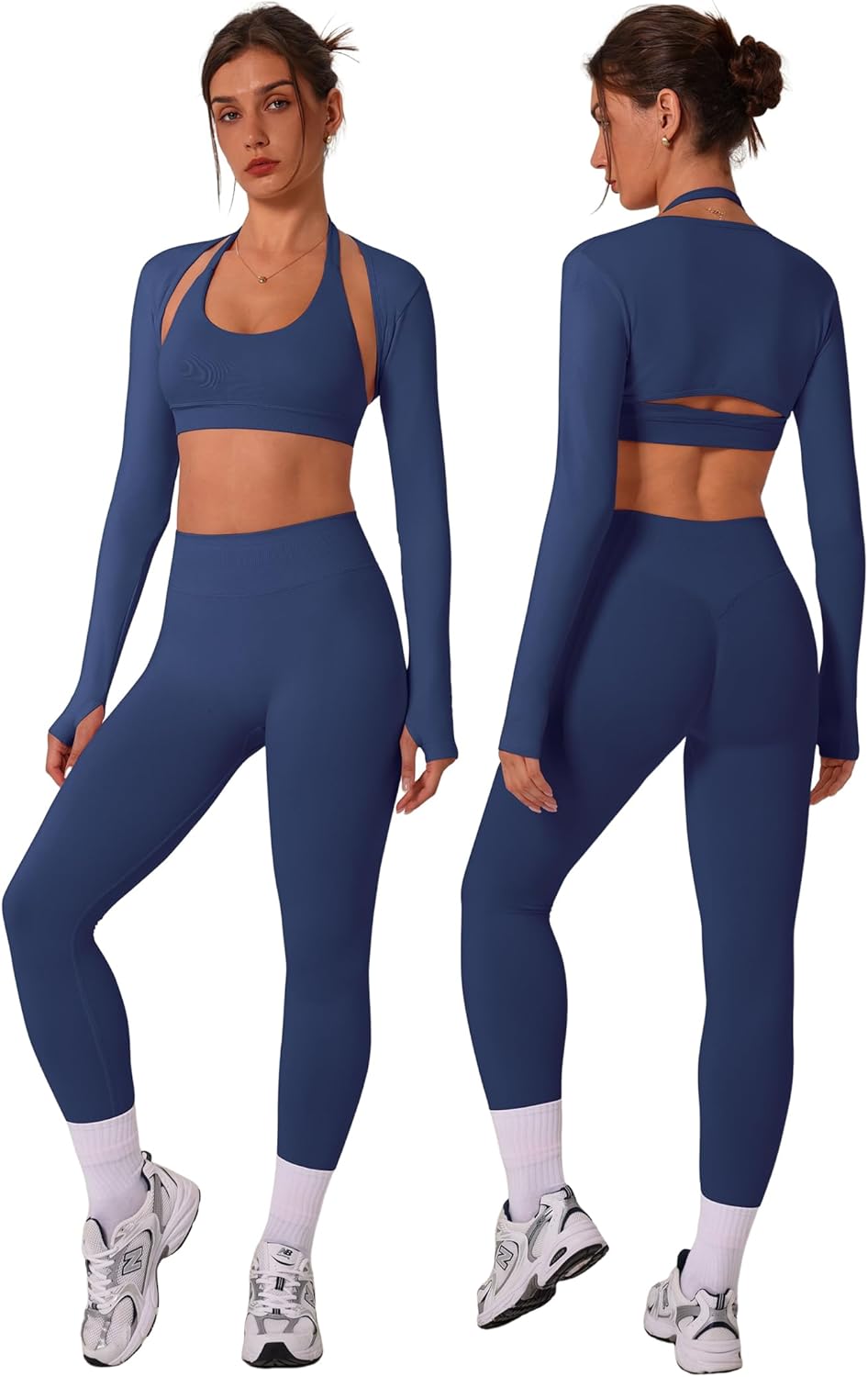 3 Piece Workout Sets for Women Seamless Halter Sports Bra High Waist Leggings Long Sleeve Shrug Gym Yoga Outfits