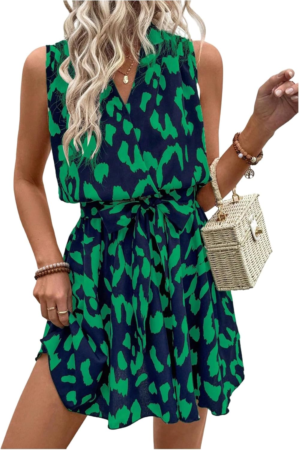 SOLY HUX Women's Summer Dress Printed Sleeveless V Neck Wrap A Line Flowy Belted Vacation Short Dresses