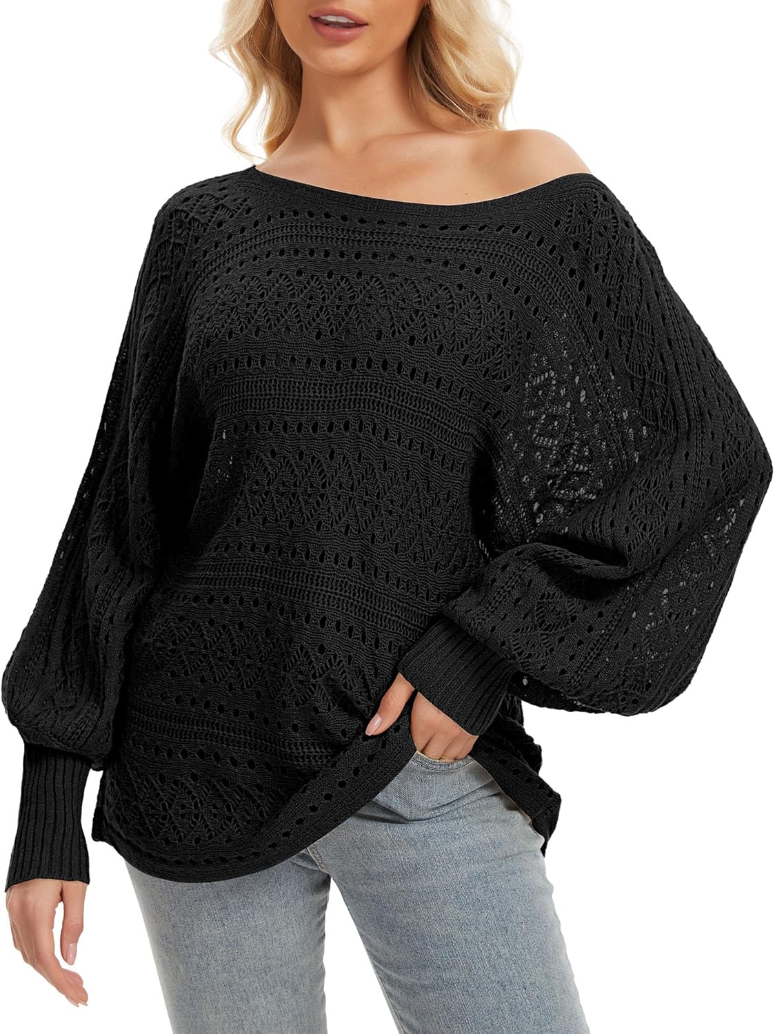 Womens Off Shoulder Sweater Top Long Sleeve Crochet Hollow Out Knit Pullover Sweaters Fall Winter Oversized