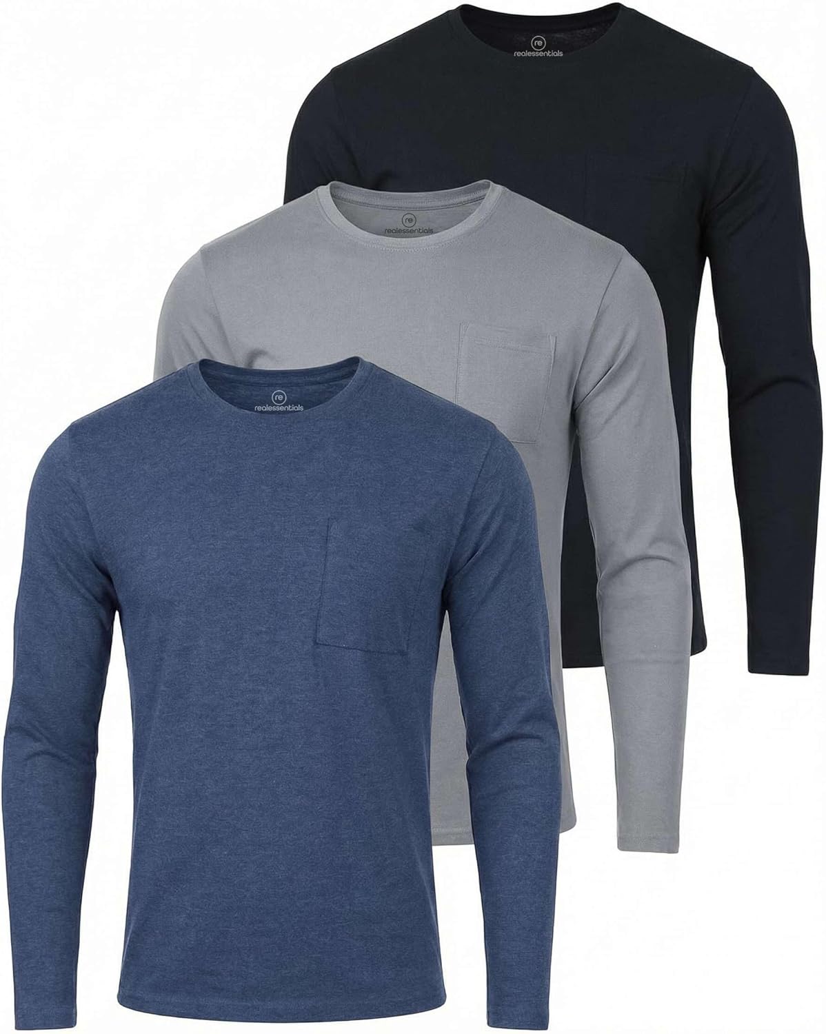 Real Essentials 3 Pack: Men's Cotton Long Sleeve Crew Neck T-Shirt with Pocket - Soft Work Casual Jersey Tees (Big & Tall)