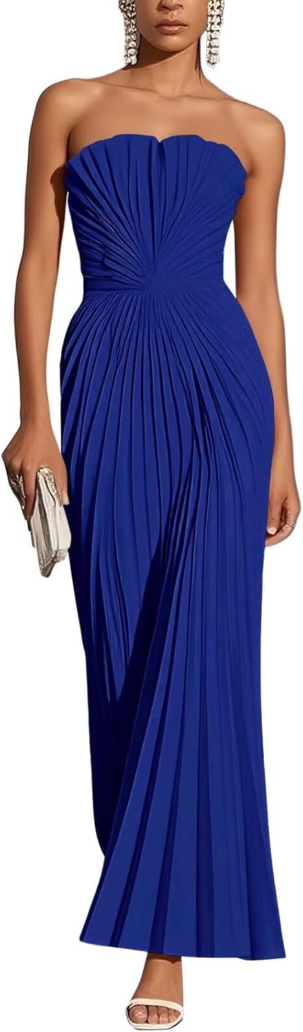 Cudiew Strapless Satin Wedding Guest Dresses Pleated A Line Long Formal Evening Cocktail Dress for Women