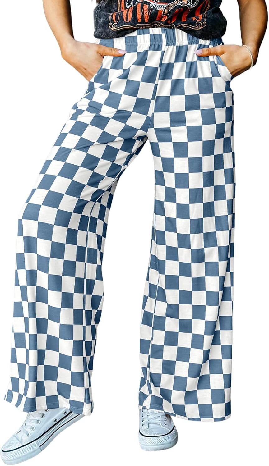 Acelitt Womens Casual Checkered Pants Elastic Waist Comfy Loose Wide Leg Pants with Pockets