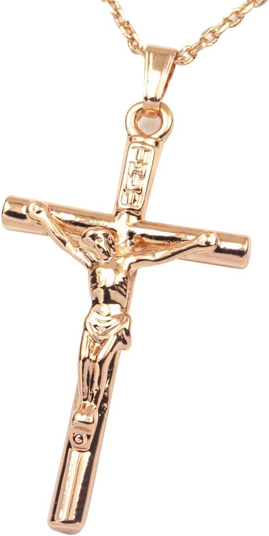 FC JORY White & Rose Yellow Gold Plated Cross Jesus Christ Crucifix Cross Pendant Chain Necklace