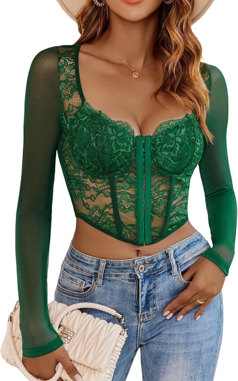 Avidlove Women Mesh Top Lace Crop Top Long Sleeve Sheer Blouse Y2K Mesh Shirts Sexy Going Out Tops Club Outfits