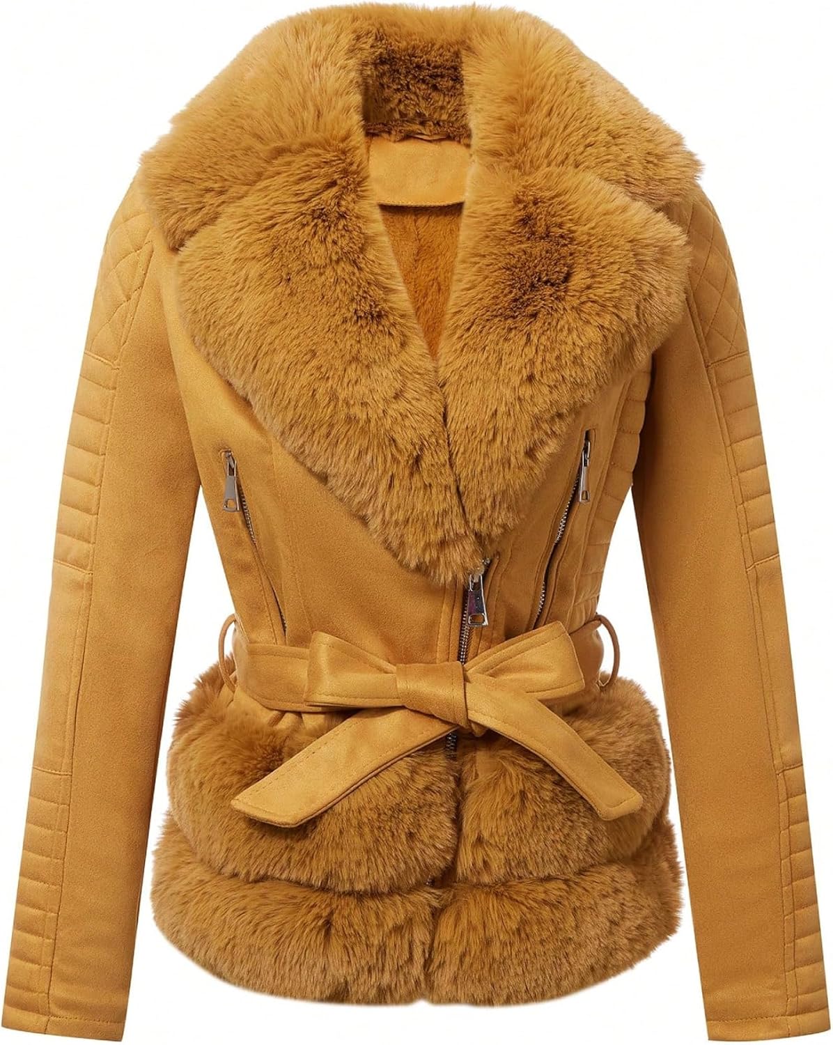 Women's Faux Leather Jacket Spring Motor Biker Clothes Outfits Sherpa-Lined Coat with Removable Fur Collar