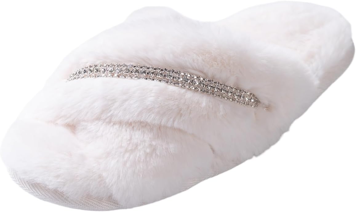 Women's Fuzzy Slippers Cross Band House Shoes Memory Foam Open Toe Slippers for Color: White/Crystal Size 8-8.5