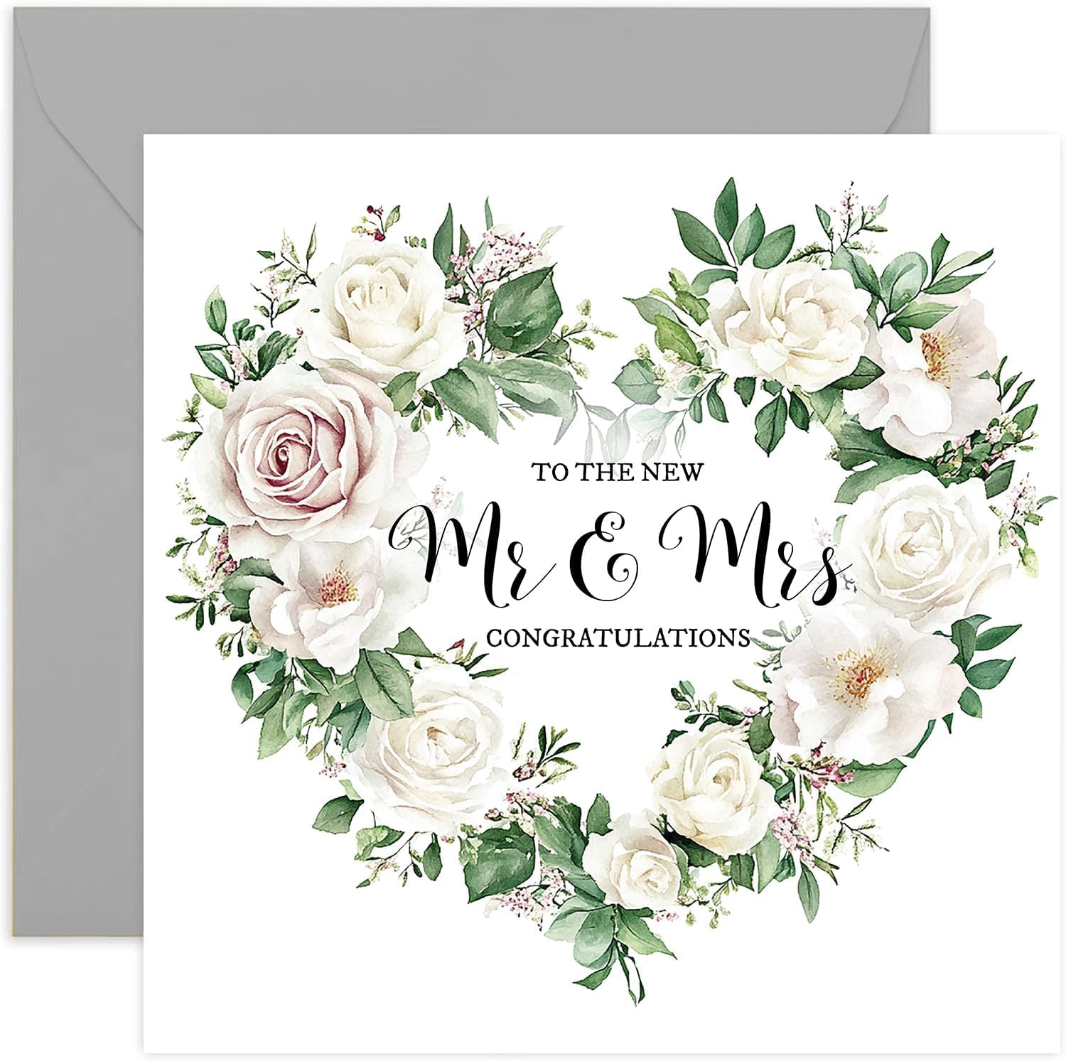 Wedding Day Card for Couple - Mr and Mrs Greeting Card - White Flower Heart Wreath Congratulations Card for Newly weds - Just Married Greeting Cards | Blank Inside