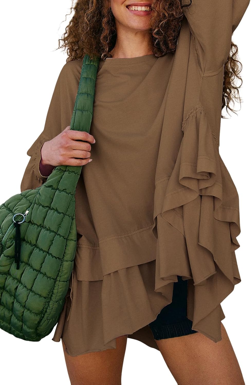 Womens Long Sleeve Oversized Tshirts Flowy Peplum Top Loose Fit Tunics Tops to Wear With Leggings Workout Shirts Khaki