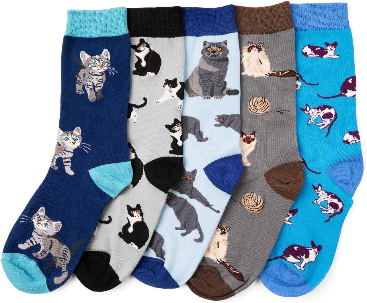 VNG Women's Cat Pattern Crew Socks, 5 Pairs in Assorted Colors