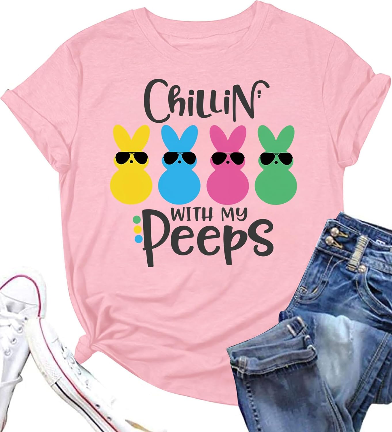 Easter Shirts for Women Chillin with My Peeps Shirt Cute Rabbit Graphic T-Shirt Bunny Shirt Easter Gift Tops