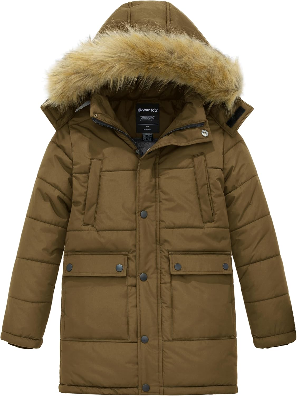 wantdo Boys' Winter Coat Long Puffer Jacket Warm Parka with Removeable Faux Fur Hood