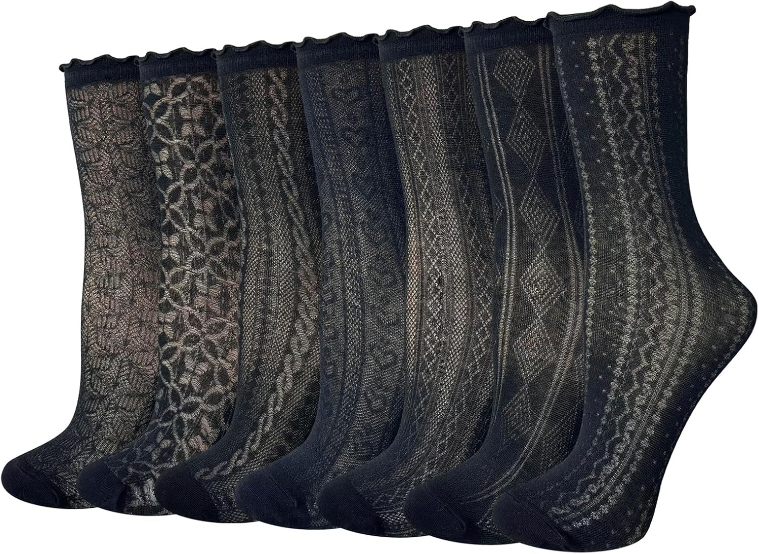 Cityelf 7 Pack Women's Black Ruffle Socks Mesh Lace Cotton Casual Crew Ultra Thin Frilly Ankle Socks