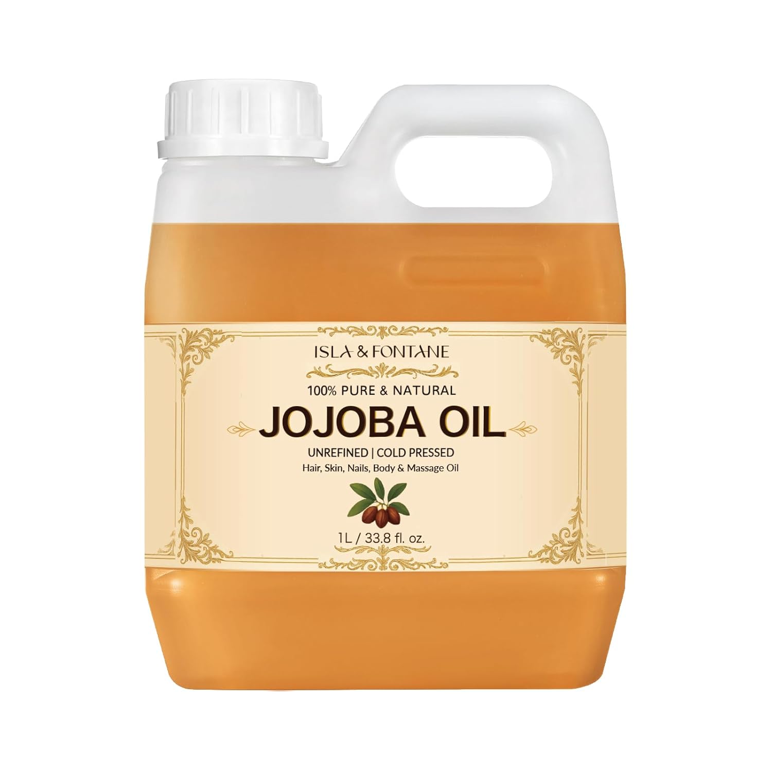ISLA & FONTANE Jojoba Oil – 1L (33.8 fl oz) | 100% Pure & Natural | Golden, Unrefined, Cold Pressed | Hexane-Free Carrier Oil for Skin, Hair, Face, Nails & Body Moisturizing