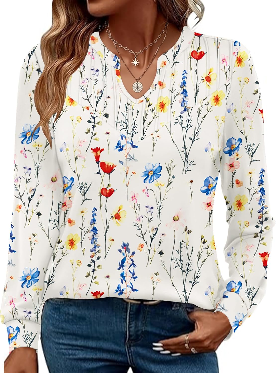 Rapbin Womens Long Sleeve Tops V Neck Dressy Casual T Shirts Trendy Pleated Tunic Shirts Loose Fit Basic Blouses
