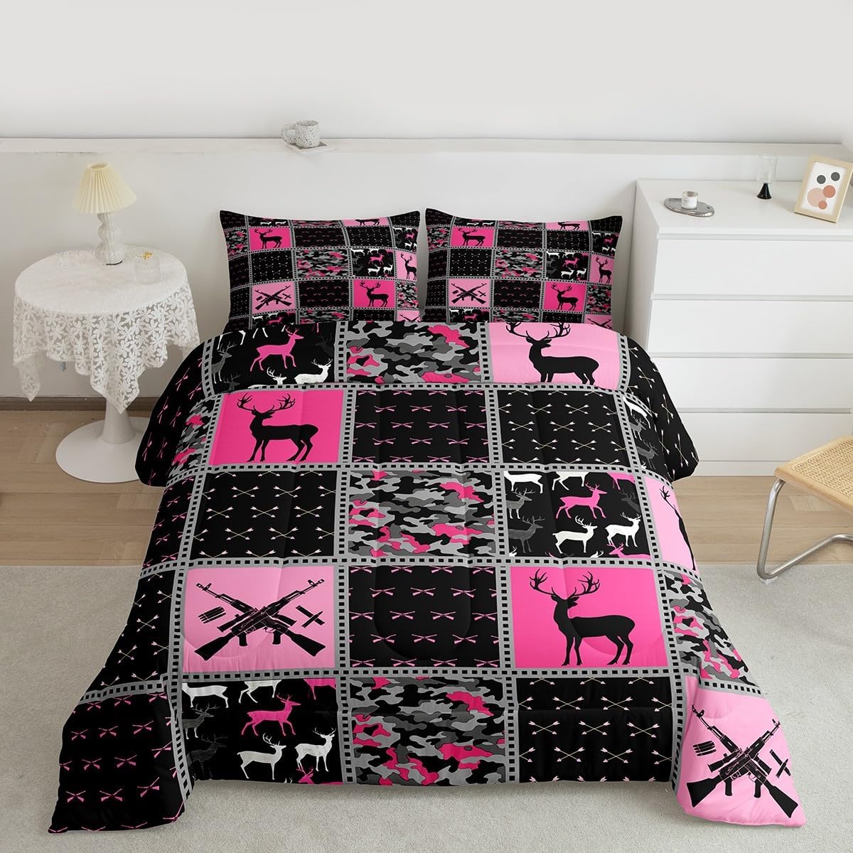 Feelyou Twin Size Cute Deer Bedding Set Boys Girls Deer Hunting Camo Comforter Set for Kids Women Men Ultra Soft Antlers Western Farmhouse Comforter Pink Black Duvet Set Room Decor Quilt Set
