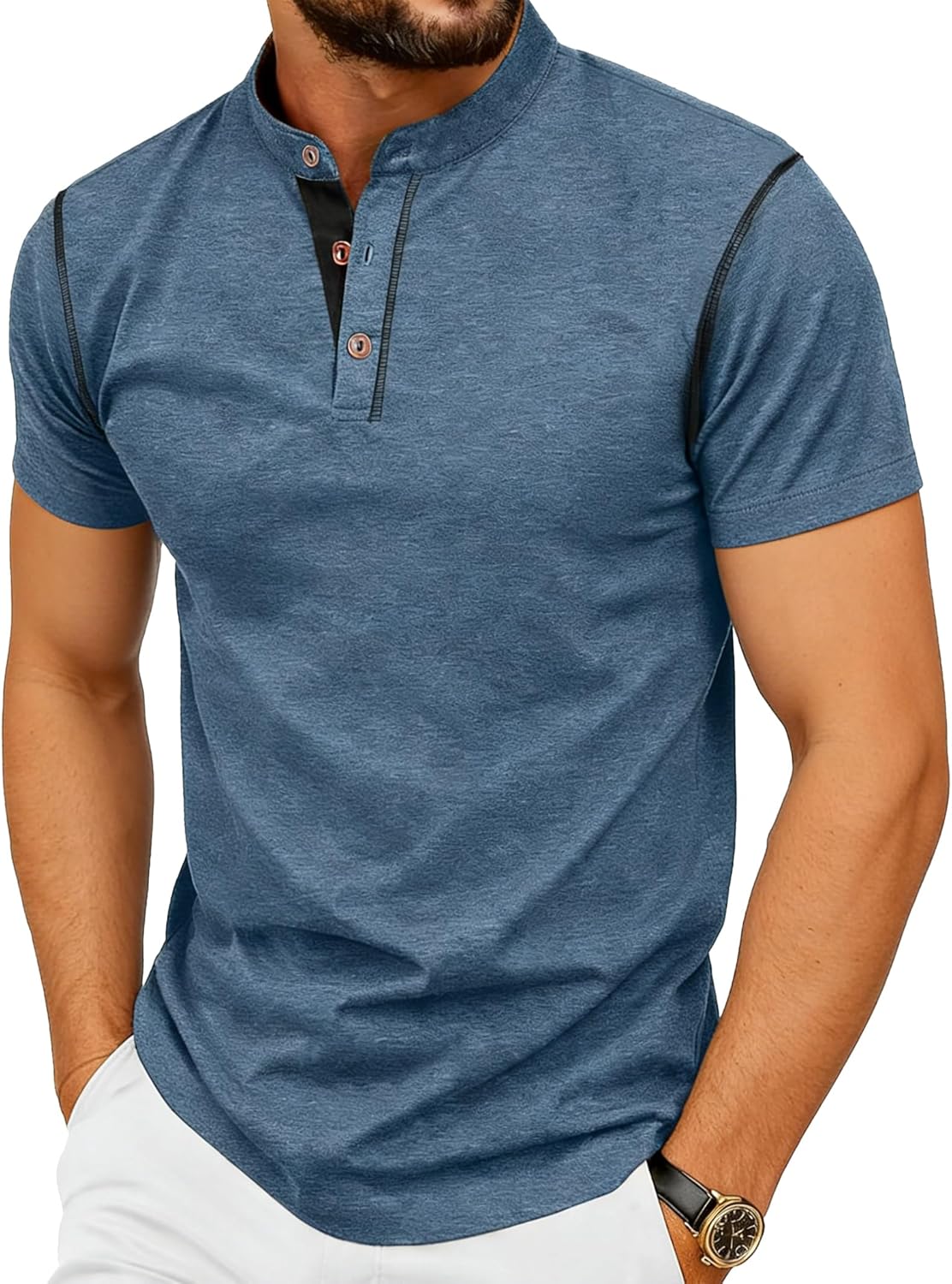PEGENO Henley Shirts for Men Casual Cotton Shirt Banded Collar Designed Placket Mens Summer Shirts