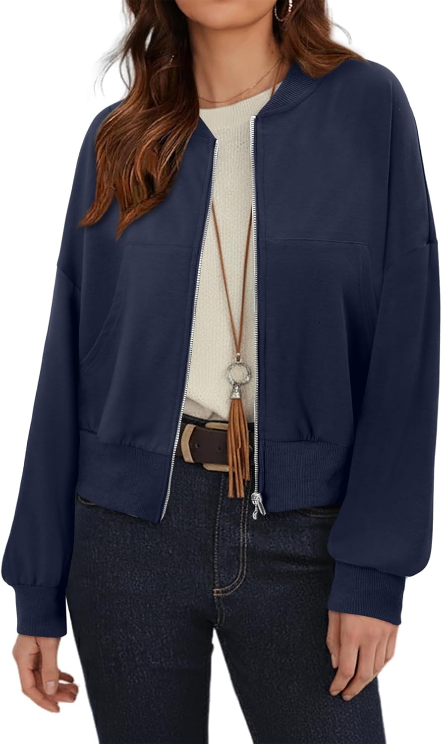 CRAZY GRID Womens Fashion Full Zip Up Jacket Comfy Long Sleeve Cropped Gym Top Solid Color Outfits with Pockets