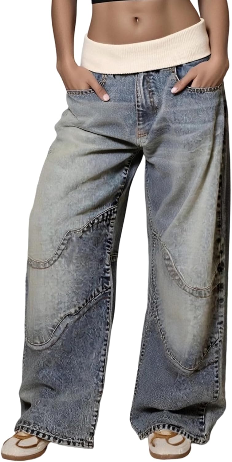 NRTHYE Women's Baggy Cargo Jeans Casual High Waisted Patchwork Denim Pants Straight Wide Leg Loose Streetwear Trousers
