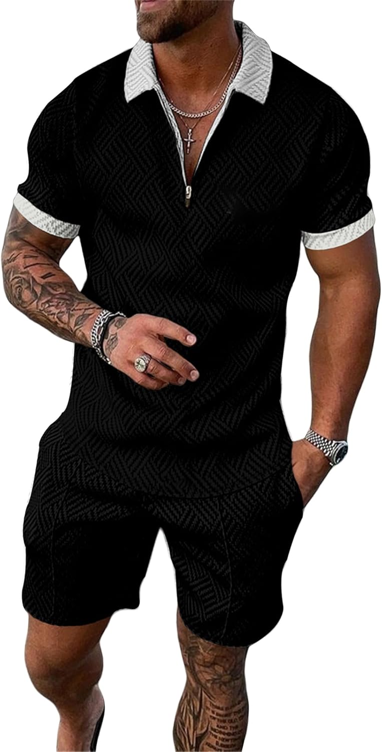 Aulemen Mens 2 Piece Zip Tracksuit Short Sleeve Print Polo Shirt and Shorts Sets Summer Outfits for Men