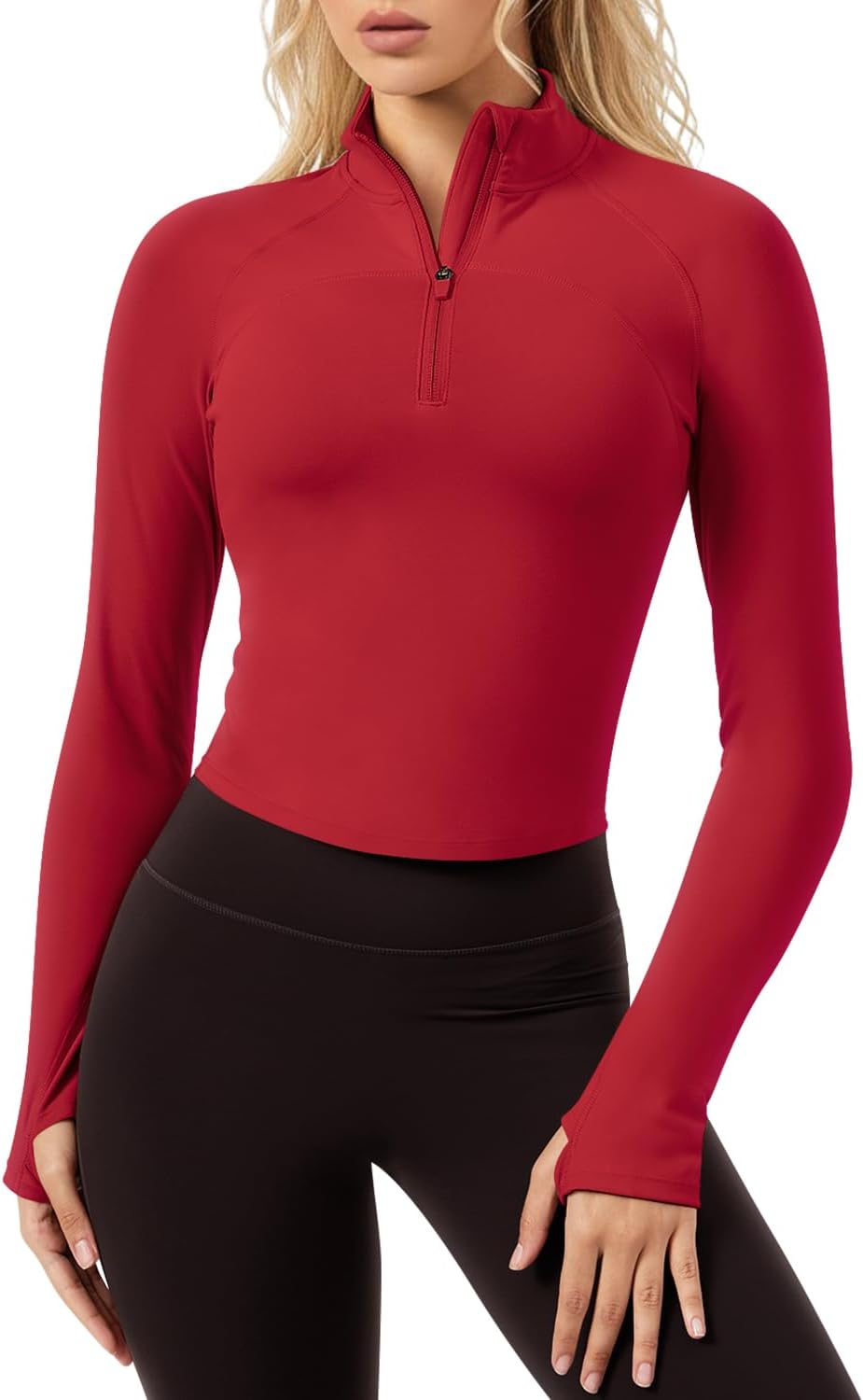 QUEENIEKE Women's Cropped Workout Jacket Half Zip, BBL Compression Long Sleeve Athletic Shirt Pullover Top Gym Thumb Holes - Image 4