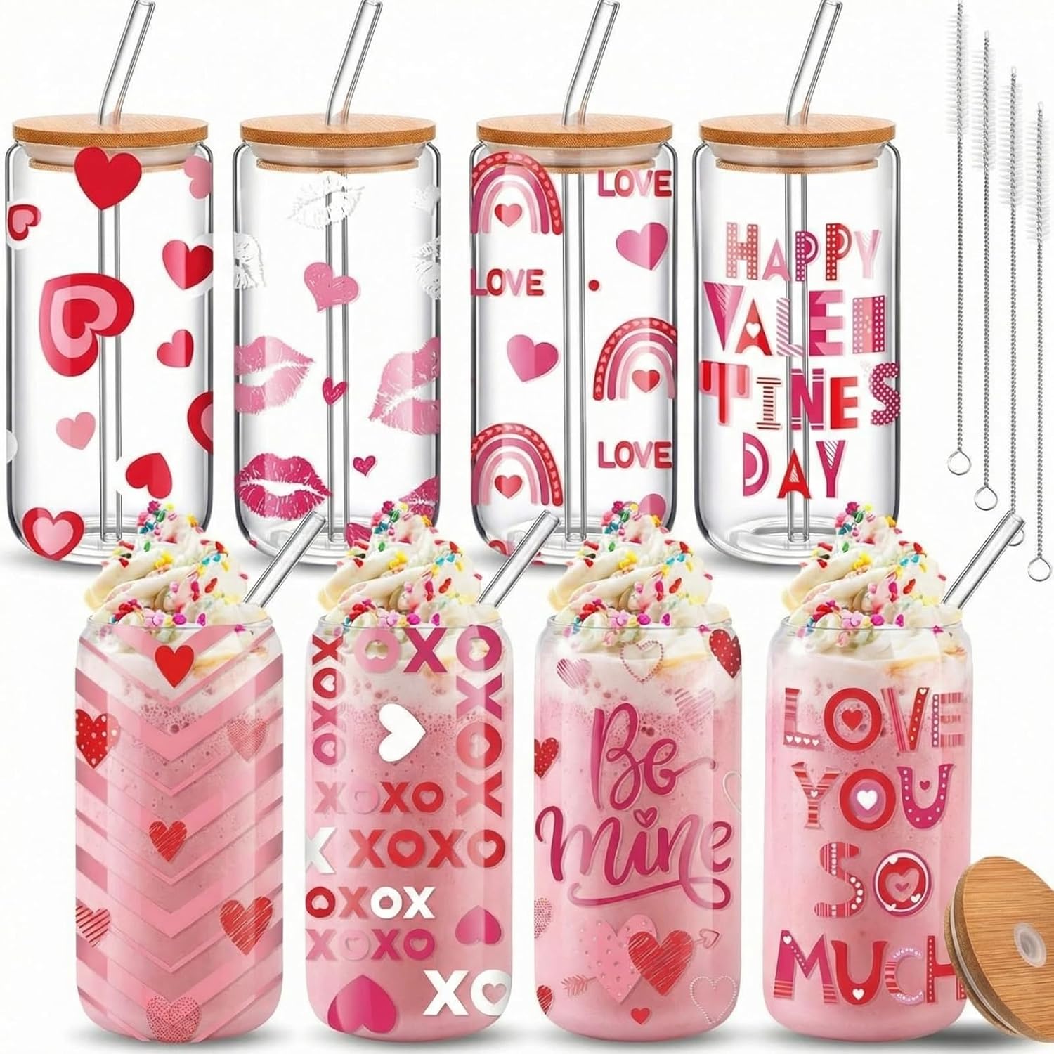 Umigy 8 Pcs 16oz Valentine's Day Glass Tumbler Pink Heart Iced Coffee Cup with Bamboo Lids and Glass Straw Valentine's Day Gift for Her Cute Cup for Anniversary Dinner Party Supplies