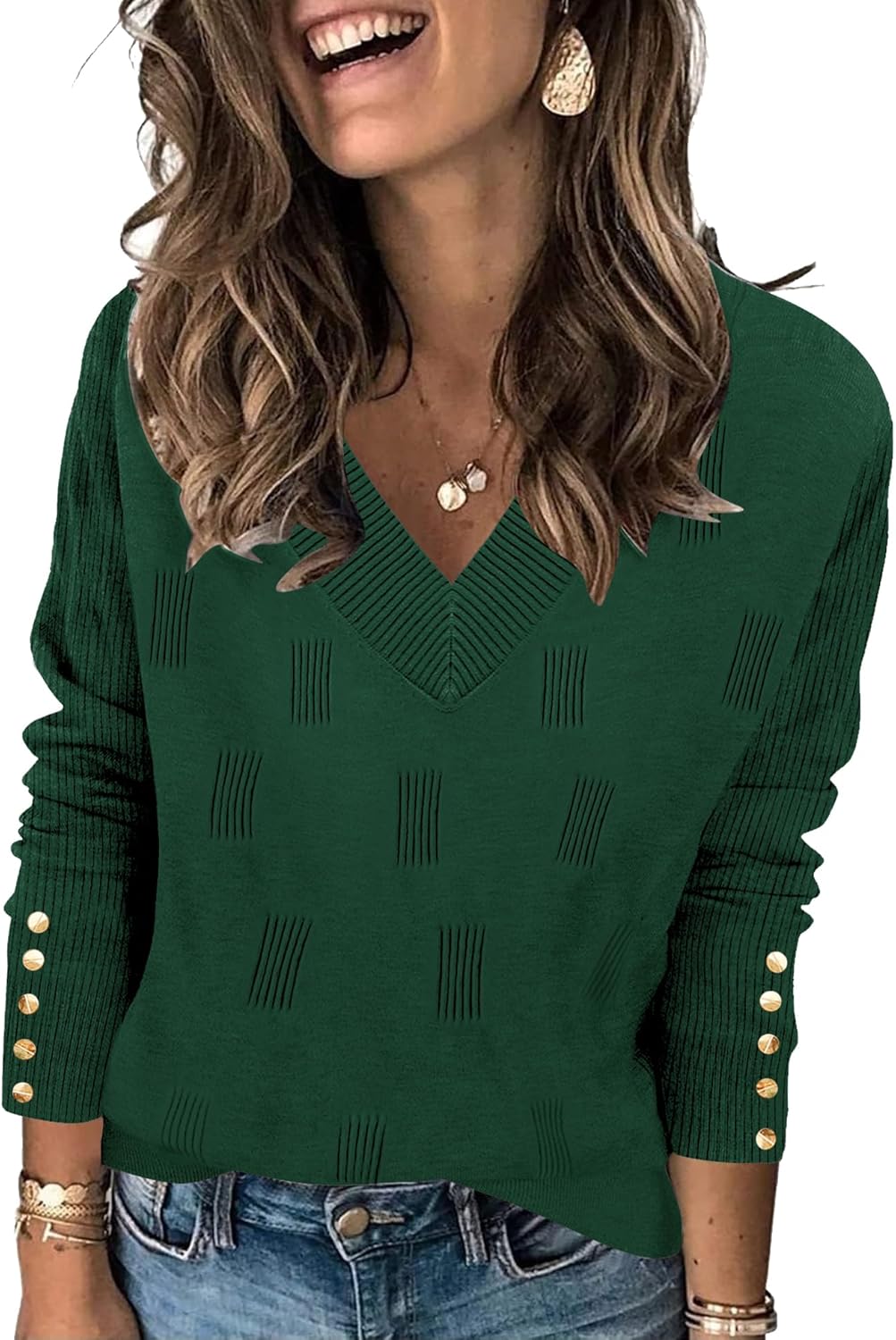 AKEWEI Womens V Neck Sweaters Long Sleeve Lightweight Knit Pullover Tops with Decorative Buttons