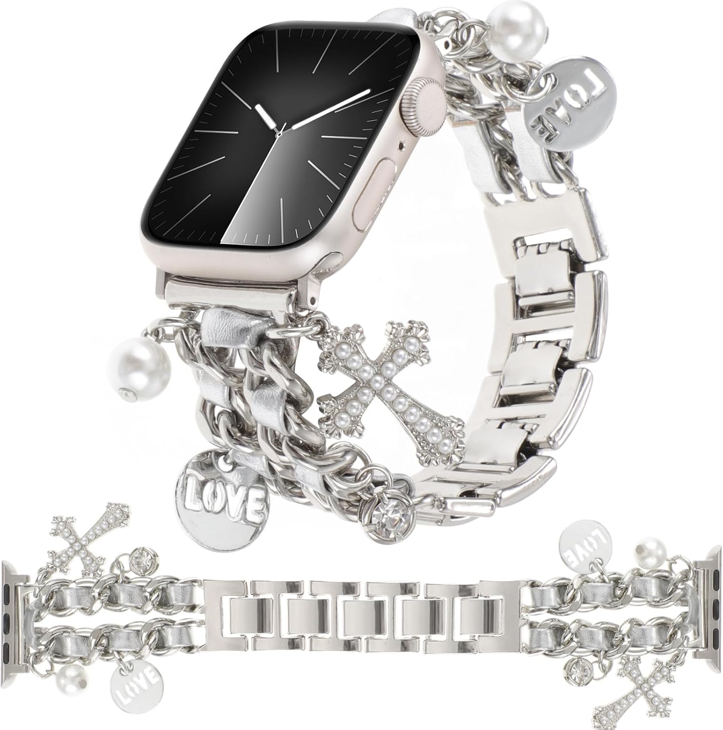 Stylish Metal Bands Compatible with Apple Watch Band 49/46/45/44/42mm 41/40/38mm Women,Cuban Chain Band with Cute Pendants Love Cross Charms Strap for iWatch Series 11 10 9 8 7 6 5 4 SE/Ultra 3 2 1