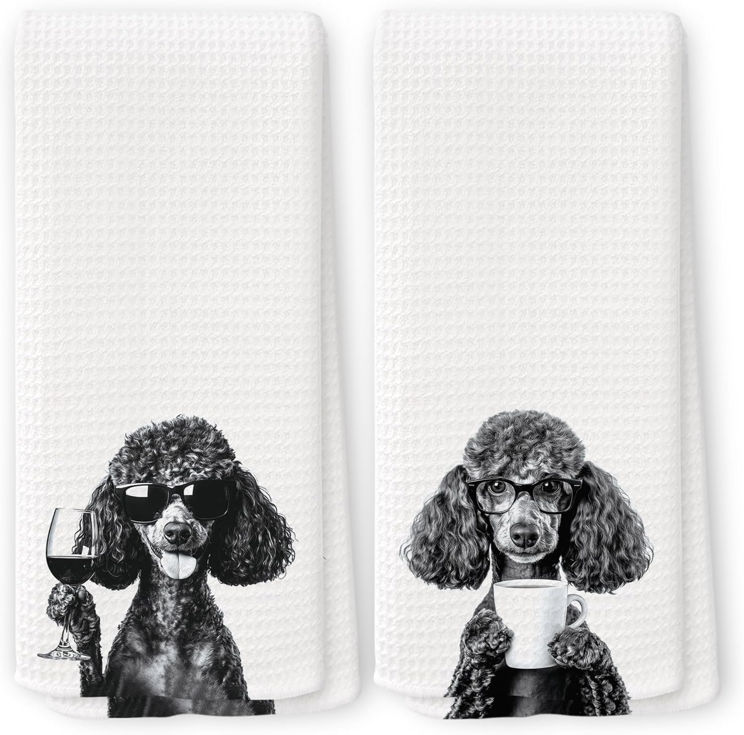 Funny Black Poodle Kitchen Towels Set of 2, Wine and Coffee Lover Gifts, Bar Accessories Dog Dish Tea Towels for Kitchen, Housewarming Gift Cute Animal Decorative Hand Towel 16x24 Inch